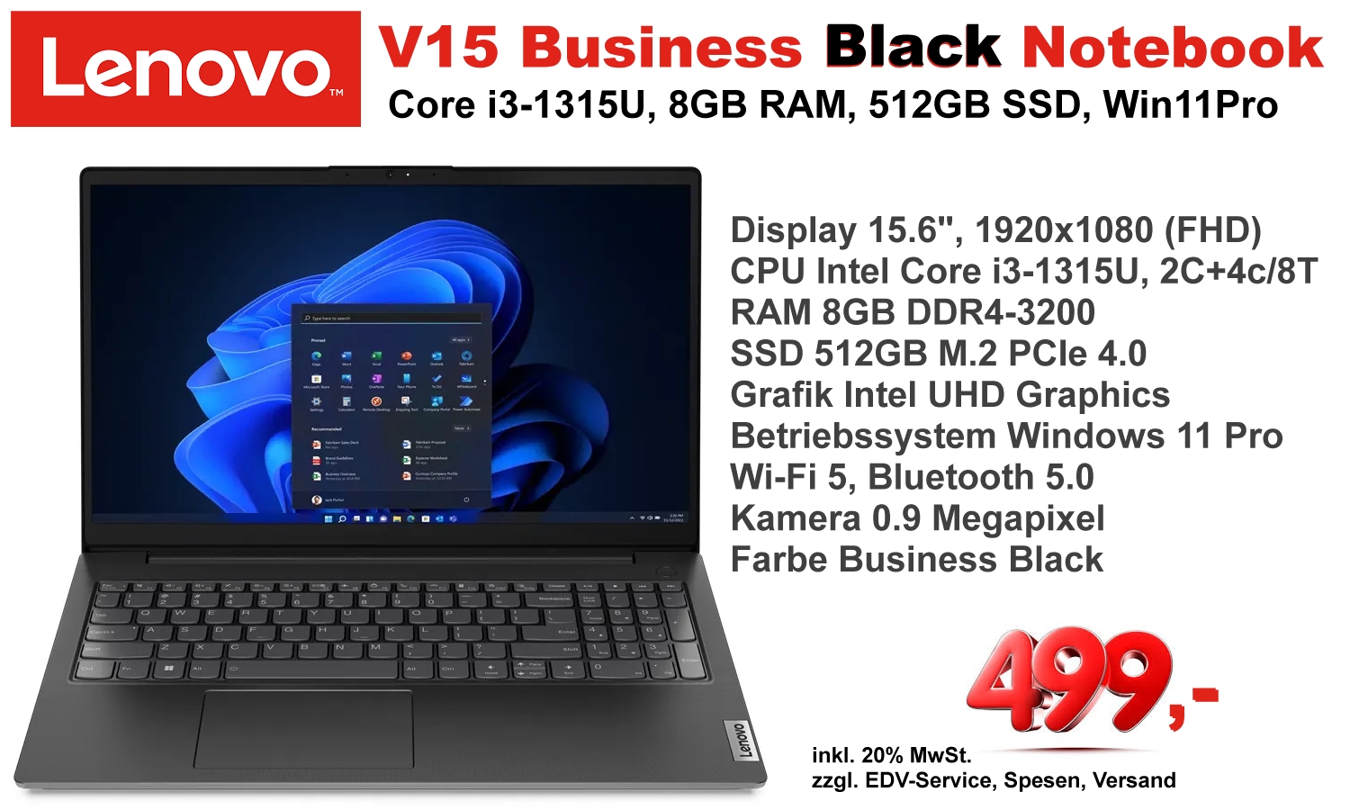 Unsere aktuelle Notebook-Aktion! Zum Vergrößern anklicken. Das Lenovo V15 Business Black Notebook ist mit einem starken Intel Core Prozessor der 13. Generation mit bis zu 4.5GHz Taktung, 8GB RAM und einer super schnellen 512GB SSD Speichereinheit ausgestattet. Zudem ist es sehr handlich mit seinem 15,6" Full HD-Display. Das Betriebssystem ist Windows 11 Professional, das bereits vorinstalliert ist. Das Gerät ist vollkommen betriebsbereit und mit Windows vorinstalliert. Auf Wunsch kann das Gerät von uns mit Microsoft Office 2024 ausgestattet werden. Das Gerät ist bei uns lagernd! Achtung! Die Datenimplementierung (Datenübernahme) samt Einrichtung E-Mail Konto, Druckerinstallation etc. von einem etwaigen Vorgänger-PC oder Notebook sind bei dieser Aktion mit einem pauschalen Aufpreis von € 99,- möglich. Das Gerät ist danach vollkommen und sofort betriebsbereit und erfüllt alle Kundenwünsche und Adaptierungen!