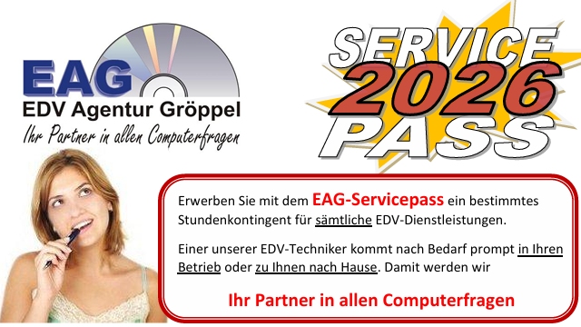 Mit einem EAG-Servicepass sparen Sie auch 2025 bei Ihrem persönlichen EDV-Service bares Geld! Sie erwerben ein Stundenkontingent von 4, 8, 12 oder 20 Stunden (à 60 Minuten) im Vorhinein. Je höher das Kontingent, desto günstiger wird das EDV-Service, das zum Normalpreis von € 170,- inkl. 20% USt pro Stunde angeboten wird. Das Kontingent hat kein Ablaufdatum sondern gilt solange, bis es verbraucht ist. Dazu gibt es viele Vorteile, die der Servicepass mit sich bringt: gratis Anfahrt, Terminvorreihung, Hardwarerabatt etc. Viele unserer Kunden schwören auf diese Art bares Geld beim EDV-Service zu sparen! Ordern Sie den EAG-Servicepass telefonisch, per E-Mail oder Kontaktformular.